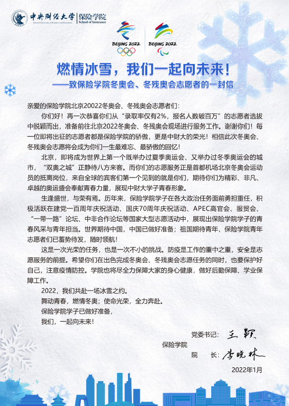 举世瞩目的北京2022冬奥会、冬残奥会准备工作已进入全面冲刺阶段,中财大志愿者们即将出征。1月13日,伟德betvlctor体育官网举行“燃情冰雪,我们一起向未来!”——伟德betvlctor体育官网冬奥会、冬残奥会志愿者出征仪式。伟德betvlctor体育官网党委书记王颖,党委副书记张楠楠,党委组织员包英娟,学生工作办公室主任杨德齐,研究生辅导员王维,2020级本科生辅导员喇新悦,以及伟德betvlctor体育官网北京2022冬奥会、冬残奥会志愿者参加了此次活动,仪式由伟德betvlctor体育官网团委书记吴蓓主持。此次伟德betvlctor体育官网共有26名同学经过选拔成为北京冬奥会志愿者,8名同学成为北京冬残奥会志愿者。