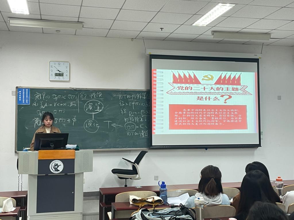 支部书记尹秀洁向大家介绍了本次针对二十大精神专题学习活动的主要内容。知是行之始,行是知之成。近日,党中央发布了二十大报告全文和新修改党章,支部就深入学习宣传贯彻党的二十大精神进行动员,不断推进学习,掀起学习热潮。她表示,深刻领会报告精髓要义,抓好学习研讨,对于进一步提高党员同学的政治思想觉悟以及民族自豪感有着深刻的作用。让我们共同学习党的二十大精神,让二十大精神走入我们的心中,走进我们的生活。