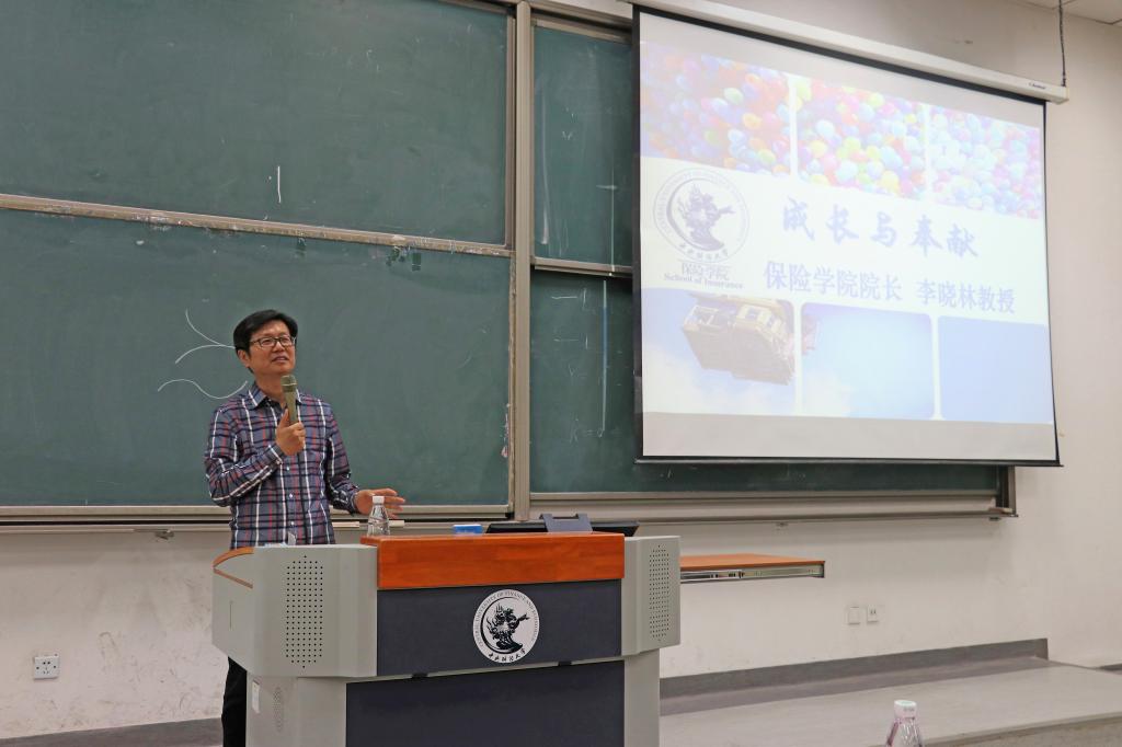 典礼之后,院长李晓林教授结合自身的学习研究、教学经历及成长过程,为91名研究生做了一场别开生面的“院长谈治学”专题讲座。李晓林教授用自己的亲身经历告诫同学们要注重“知识和学科的责任、立志于学”,明确“学习与成长”、“道路、科学方法与创造”、“师从与择友”等的关系;充分认识“在充满不确定性的经济社会发展中发挥保险、精算、社会保障体系的重要作用”,妥善处理好“知识背景与研究方向、渊博深邃与研究专注、学习与科研、热诚与持久、创造与接受、大原则与小点滴、批判性思维与谦和为人”等的关系,在不断的实践、创造、奉献中获得成长。李晓林院长的敦敦教诲,如细雨轻风般深入学生的脑海之中,为研究生新生上了生动的第一课。