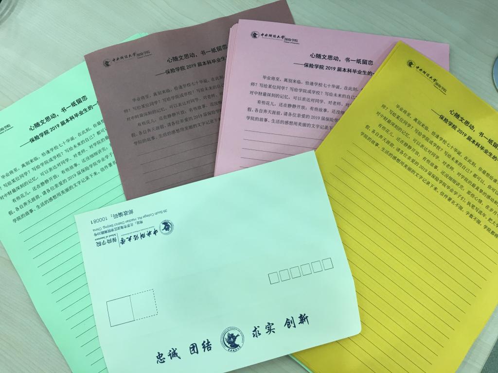 保险学校响应学校号召,对毕业生进行“薪火传承,志在家国”的主题教育,在毕业生中开展“心随文思动,书一纸留恋”活动,给每一位2019届毕业生发放信纸和信封,同学们可以把心中的学校印象、学院故事、生活感想和复杂情愫用美丽的文字记录下来。