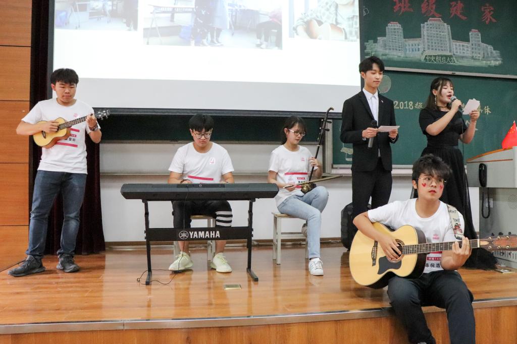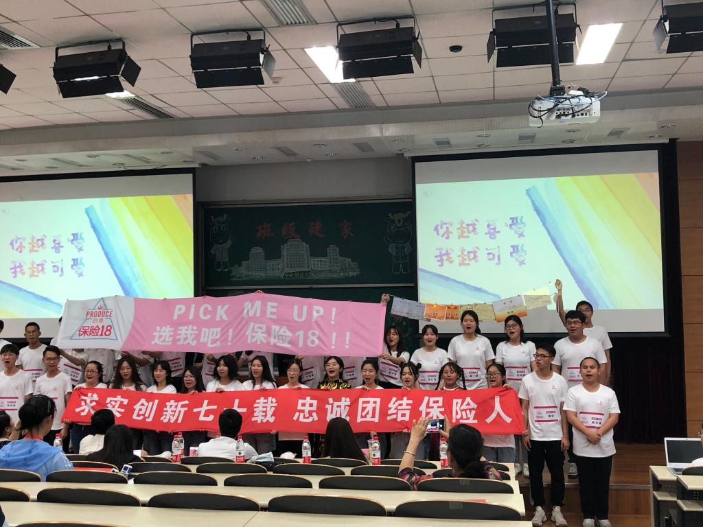 保险18班以“拼搏奋进正青春 风华正茂谱华章”为主题,融入社会主义核心价值观和党的十九大精神与习近平新时代中国特色社会主义思想,引入“练习生”、“成团出道”的概念,组成四支竞演队伍分别向评委老师们展示在思想建设、班风建设、学风建设、文体建设取得的突出成果。一块块循环利用快递箱纸板、手工制作的展牌、一场场生动还原保险18班温馨日常的表演、一句句响亮而整齐的口号无一不勾勒出保险18班的青春可爱、活力四射。“你越喜爱 我越可爱”的口号更是响彻整个教室,凝聚的班魂感染了在场的每一位老师、同学。