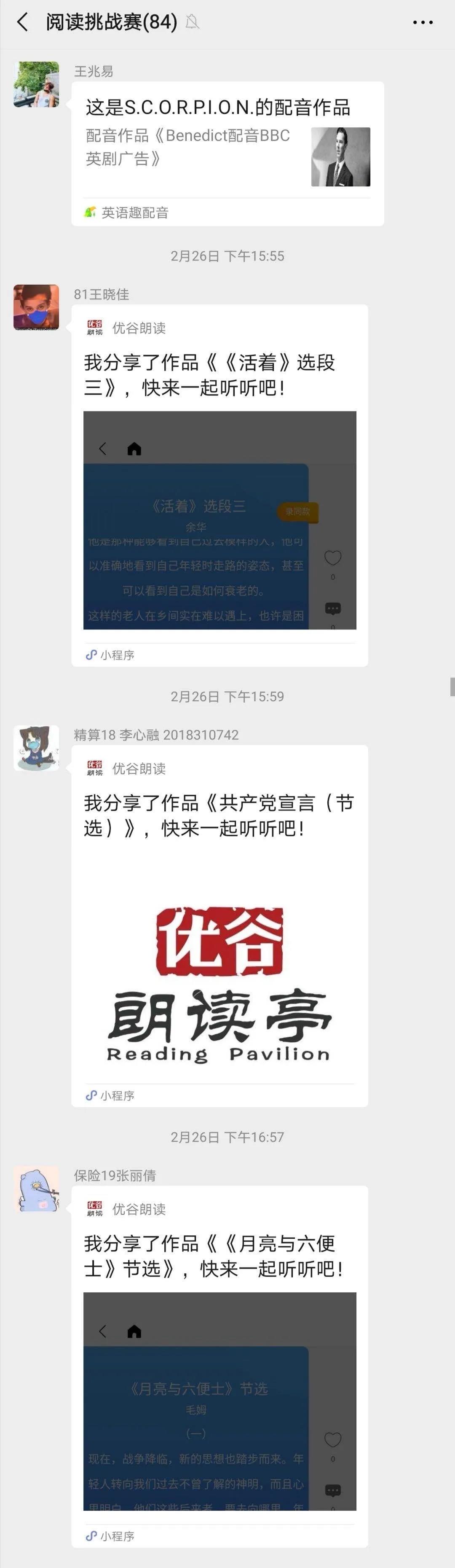 2 月 22 日,我们组织了有趣的阅读配音活动,共有 22 位同学积极 提交了自己的作品。同学们多才多艺,配音、朗诵作品丰富多彩。