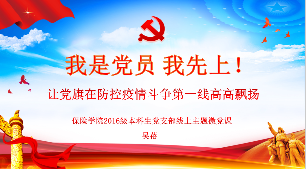 为深入学习习近平总书记对新冠肺炎疫情防控工作的重要指示精神,宣传共产党员在疫情防控一线光辉事迹,落实“放假不停学、线上云学习”要求,伟德betvlctor体育官网2016级本科生党支部举行“我是党员,我先上”线上主题微党课。党课由党支部书记吴蓓主讲,学院党委书记王颖列席会议。