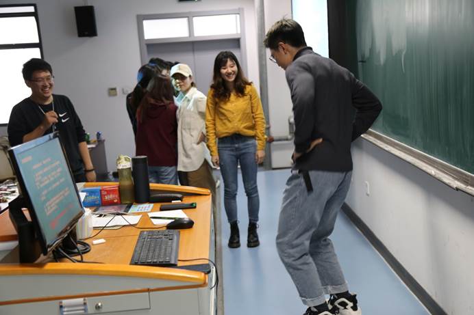 第二个游戏发掘表演潜力。游戏规则是六组分为三对AB两队,两队分别想出五个连贯的动作,一队选出一名同学进行表演,另一队依次传递表演动作,由最后一个接受者向大家表述出最开始的五个动作的原始意思。在游戏进行过程中,同学们表演生动多彩,进一步消除了同学们之间的陌生感。