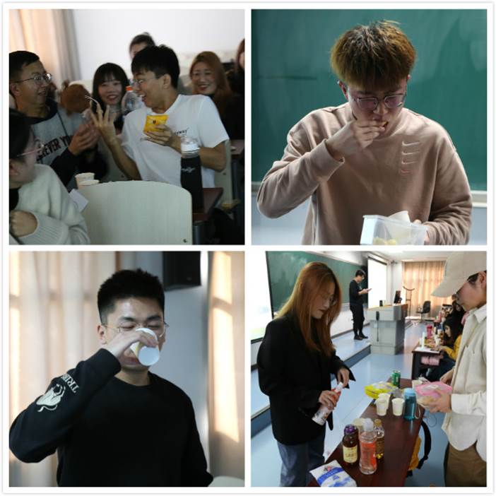 游戏互动环节,同学通过抽签分为六个小组,方便后面游戏进行。游戏共分为击鼓传花、发掘表演潜能、猜歌名、你画我猜四个部分。第一个游戏“击鼓传花”中,大家跟随动感十足的音乐将手中的小熊道具依次传递,在音乐停下瞬间,拿到小熊的同学接受了吃柠檬和畅饮自制饮料的惩罚。