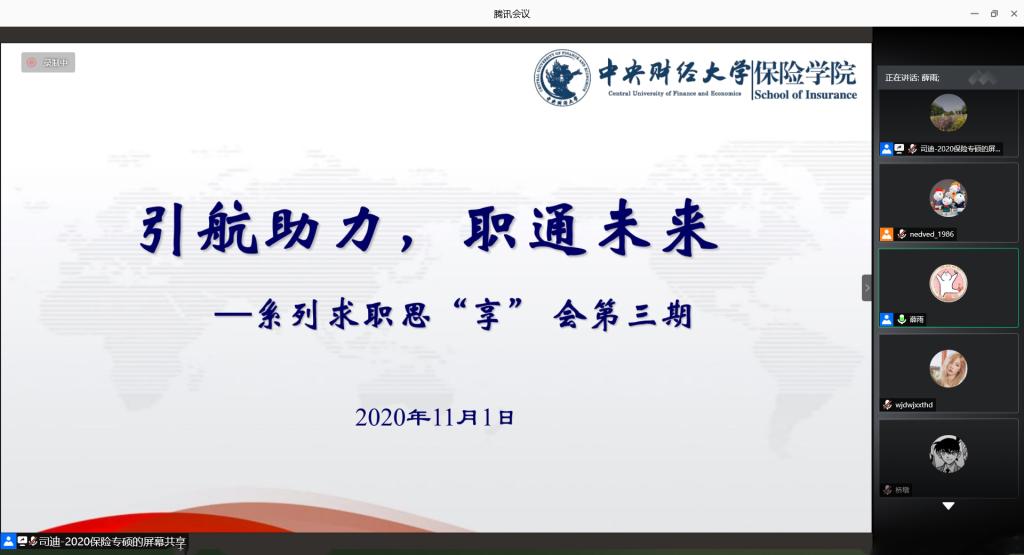 2020年11月1日晚上,由伟德betvlctor体育官网举办的“引航助力,职通未来”系列求职思“享”会第三期通过腾讯会议的方式在线上顺利举行。本次分享邀请到了在中国银行保险监督管理委员会任职的薛雨学姐作为主讲人。薛雨学姐结合自己的求职历程、求职感悟、工作内容和工作感悟等,为同学们做了精彩的分享。
