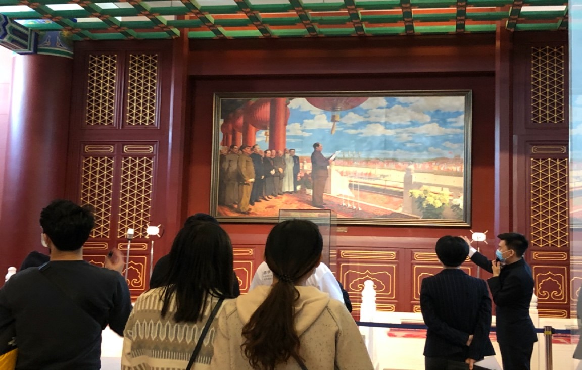 《屹立东方——馆藏经典美术作品展》则进一步通过众多经典油画、国画和雕塑作品,全景式展示中国革命从星火燎原到开国大典的苦难辉煌。特别地,同学们亲眼见到了开国大典时冉冉升起的第一面五星红旗。每位同学都激动万分,似乎身临其境地见证新中国成立的伟大历史性时刻。