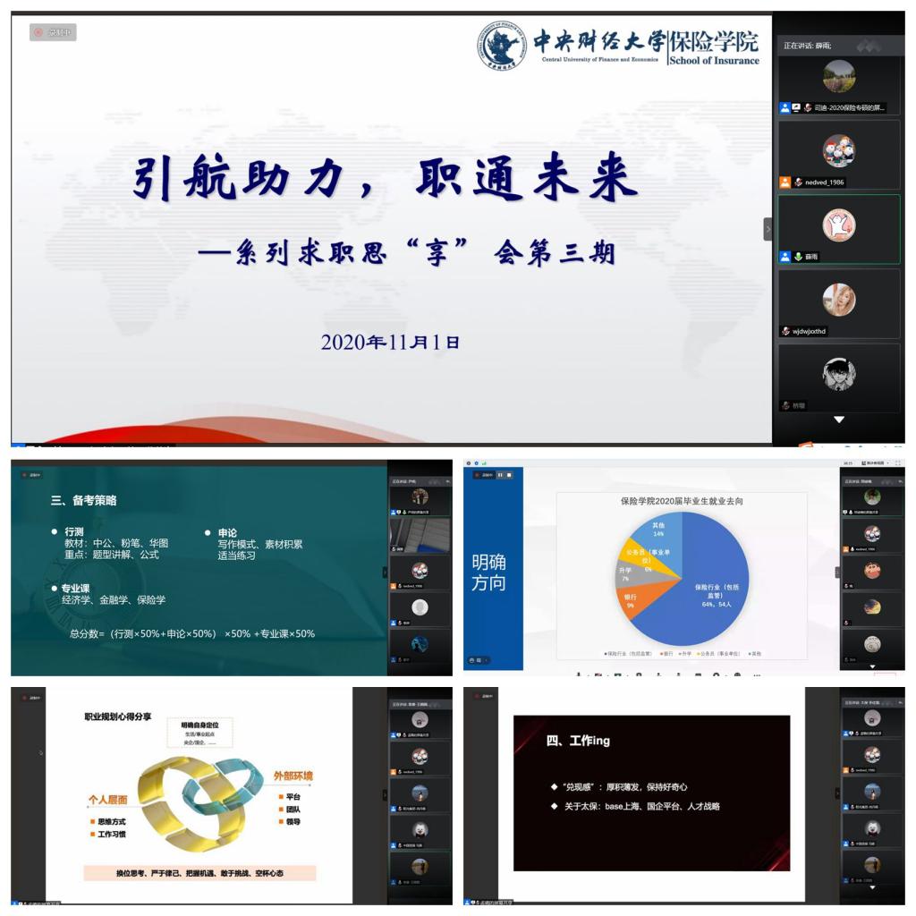 为帮助伟德betvlctor体育官网研究生同学进一步明确未来职业规划方向,了解不同机构的工作范畴和工作情况,伟德betvlctor体育官网展开“引航助力,职通未来”求职思“享”会,邀请就职于大型保险公司、银保监会等优秀毕业生分享求职经验。受疫情影响,该系列分享会均采取线上方式进行。该系列求职经验分享会进一步加深了研究生新生对未来求职方向的明确认识,帮助同学们有效地进行职业规划,提升自身的综合能力,合理调整求职心态,提升在日后求职中的综合竞争力。