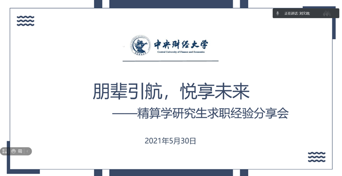 2021年5月30日上午,由伟德betvlctor体育官网2018级、2019级和2020级精算学研究生共同举办的就业经验交流会通过腾讯会议的方式在线上顺利进行。本次会议由2018级精算学研牵头,邀请到了苑兴涵、宋阳葛、郑逢萍、张帆、邱天琪、苏晖等六位同学,分享了他们在暑期实习、秋招春招、学术科研等方面的经验。