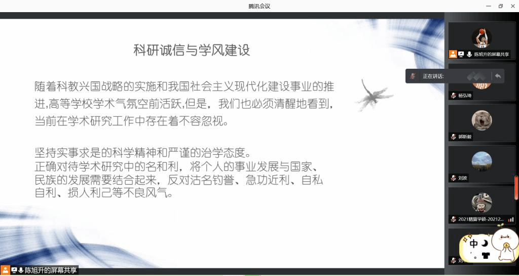 为加强学风和班风建设,倡导诚信科研和养成良好的学术氛围,2021年10月30日,2021精算研举办了“端正学术态度,践行学术诚信”主题班会。为响应学校疫情防控措施,尽量减少聚集性活动,本次班会采取线上形式,2021精算研22名同学参加了班会,会议由班长杨弘琦主持。