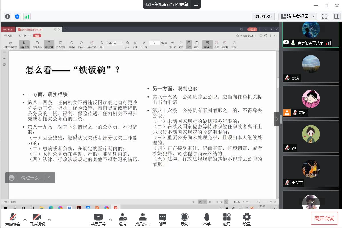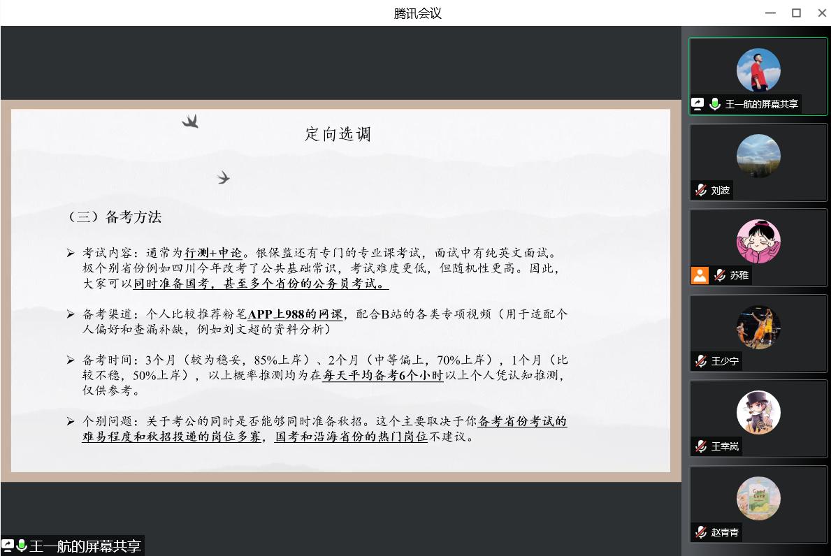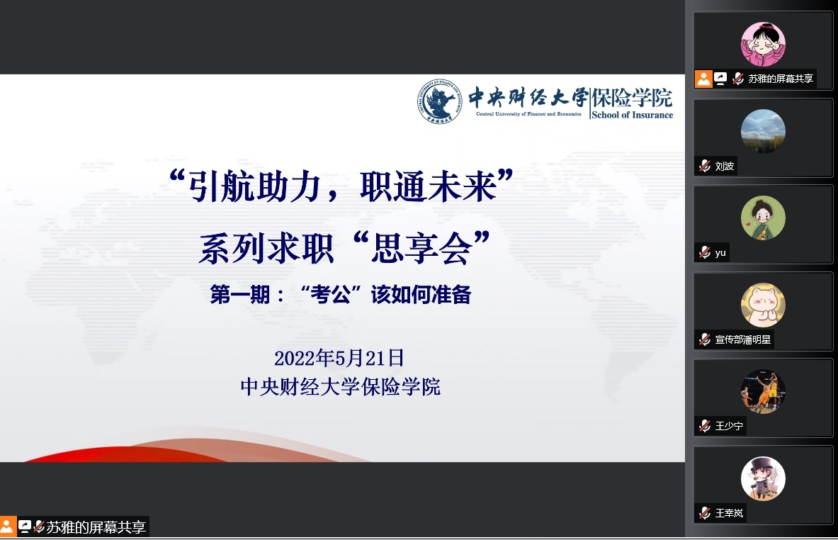 为帮助同学们更进一步了解公务员就业情况,以明确自己的就业方向和更有针对性的进行规划备考,2022年5月21日晚,伟德betvlctor体育官网“引航助力,直通未来”系列求职“思享会”第一期于线上成功举办。本次分享会邀请到伟德官网五位就职于机关单位的优秀毕业生,围绕求职经历、备考经验、工作感悟等内容与同学们交流分享,共吸引院内外70余名同学参会,进行了广泛交流,气氛热烈。