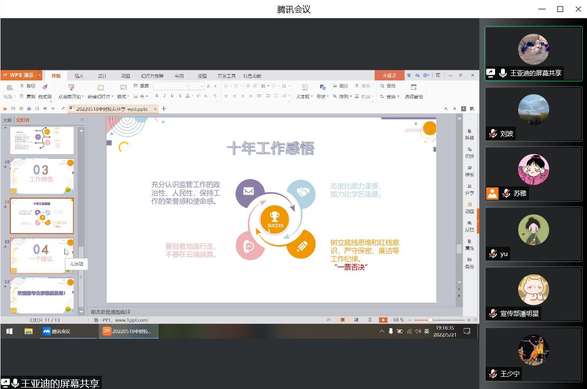 第三位分享人为2019级保险专业硕士王少宁,目前就职于宁夏银保监局。会上,他侧重从公务员考试学习内容、学习技巧、备考进度安排等方面进行经验分享。王少宁结合自身经历,从招录考试介绍、重要时间节点、笔试内容、面试准备、资料推荐和备考建议六个方面入手,深入细致地为大家分享了银保监局考试的相关经验,鼓励大家充分了解相关信息,做好时间规划,提高自身实力的同时放平心态,从容应考。