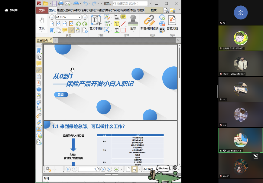 吕璇以“从0到1——保险产品开发小白入职记”为题,从寿险总部岗位概览与产品开发工作内容两大方面拆解了寿险公司总部的业务条线及产品开发岗位的职责要求。她强调产品开发岗重视个人的抗压、学习、创新与沟通协调能力,并建议计划从事精算定价的同学应保底两门精算师考试。此外,她鼓励同学们尽早明确职业规划,有针对性地开展实习和考试,在正式秋招时也要根据自己的特点进行精准投递,不要盲目从众。