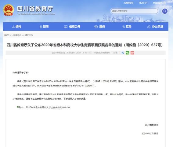 12月31日,2020年四川省大学生原创动漫大赛评审结果在四川省教育厅和四川省本科高校竞赛平台官网上陆续公布,PT平台电子游戏官网学生取得佳绩,获得一等奖1项、二等奖2项、三等奖9项,南京、刘婉毅获得“优秀指导老师”。