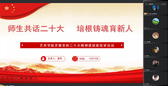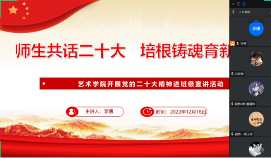 为深入学习宣传贯彻党的二十大精神,把全院师生的思想统一到党的二十大精神上来,落实立德树人的根本任务。根据《中共PT平台电子游戏委员会关于认真学习宣传贯彻党的二十大精神的通知》,PT平台电子游戏分别于12月16日至20日期间,组织开展了“师生共话二十大 培根铸魂育新人”党的二十大精神进班级宣讲活动。全体辅导员走进班级,开展“党的二十大精神”主题云宣讲会,引导PT平台电子游戏官网学子进一步了解大会精神,把握核心要义,深入推进党的二十大精神入脑入心。