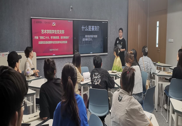党课结束后,学生党员郝文超、吴胜柳、窦玮以“二十大关键词与篆刻艺术”为创新结合,带领同学们学习二十大精神、领悟关键词,同时学习中国传统文化瑰宝——篆刻的基本知识和技法。通过作品欣赏和实践互动,让参与者在体验中进行感悟、学习党的知识、增强民族自尊心和自豪感,让主题党日“活”起来,更具趣味性、吸引力和实效性,润物无声地传播好党的声音。