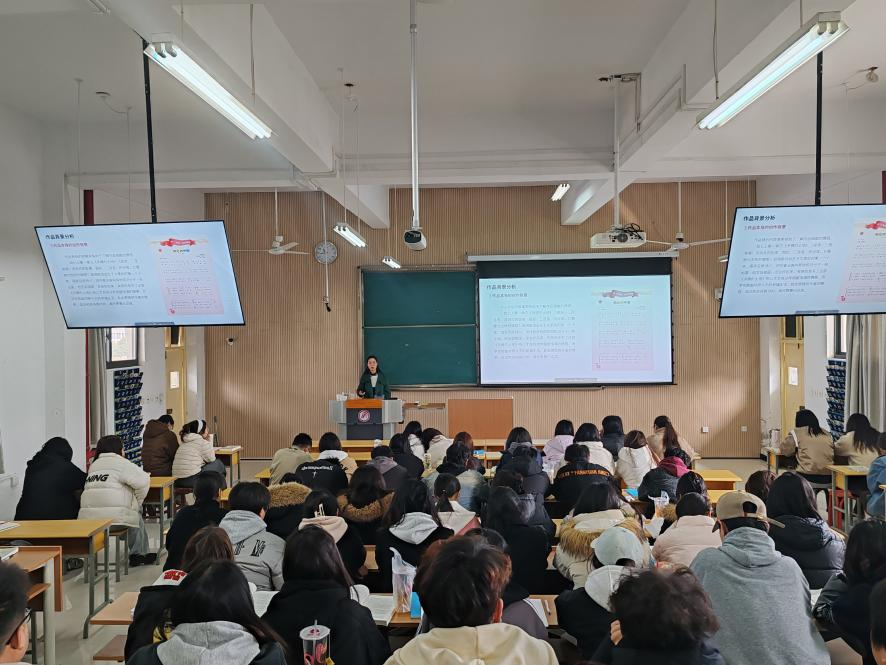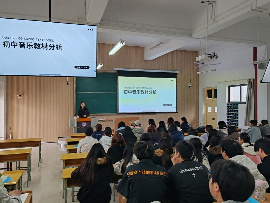 为深化师范生培养模式改革,提升音乐学专业学生对基础教育教材的解读能力与教学实践水平,3月13日、17日上午,PT平台电子游戏特邀陕西省教学能手、汉滨区汉滨初中艺体中心副主任刘平老师为2022级音乐学专业学生进行授课,该课程校内负责老师鄢志莉全程参与。