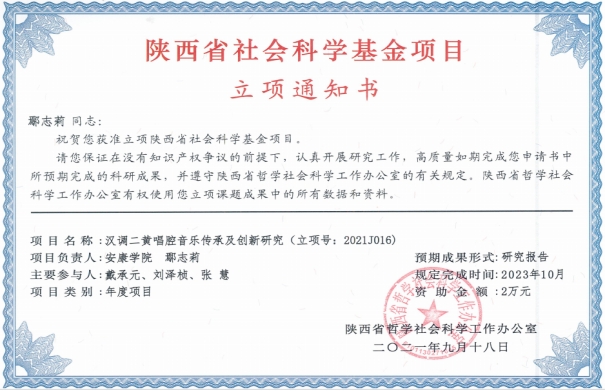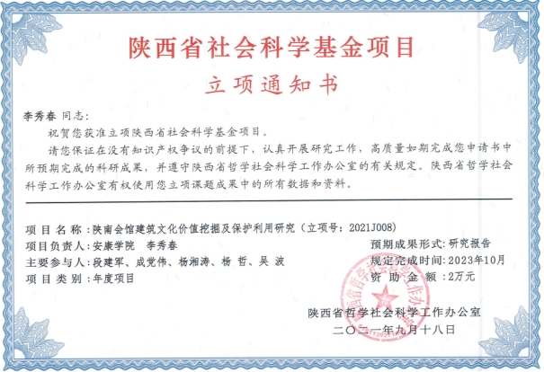 近日,陕西省哲学社会科学工作办公室公布了2021年度陕西省社科基金年度项目立项结果,PT平台电子游戏官网青年教师鄢志莉、李秀春申报的项目获批立项。