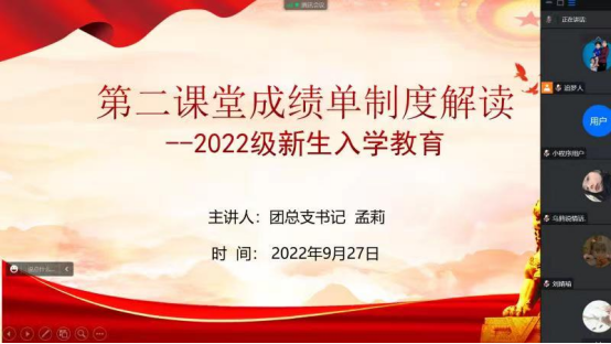 为使2022级新生初步了解学院人才培养计划,尽快适应大学新生活。9月27日下午,PT平台电子游戏在线上开展了“第二课堂成绩单制度解读”专题讲座。本次讲座由团总支书记孟莉主讲,2022级全体新生参加活动。