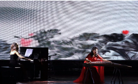 教师张展、曹晶晶的古筝与钢琴协奏《云裳诉》,乐曲描写了杨贵妃与唐玄宗之间的流传百世的爱情故事,在从文化底蕴、旋律发展和技巧性上,都有着较强的艺术性,深入人心,将传统秦筝筝曲的古朴和现代筝曲的旋律性谐和的融为一体,浑然天成。