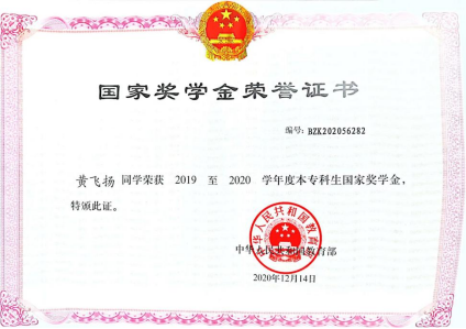 在学习上,黄飞扬取得了很大的进步,学业成绩名列前茅。他总是保持最饱满的热情和积极的态度去面对每一节专业课,课上认真对待,课下主动联系老师,讨论在专业上遇到的问题,和专业老师亦师亦友共同进步。他在自己努力进步的同时,作为班长也带动班内的学习风气,建设良好的班风、学风。