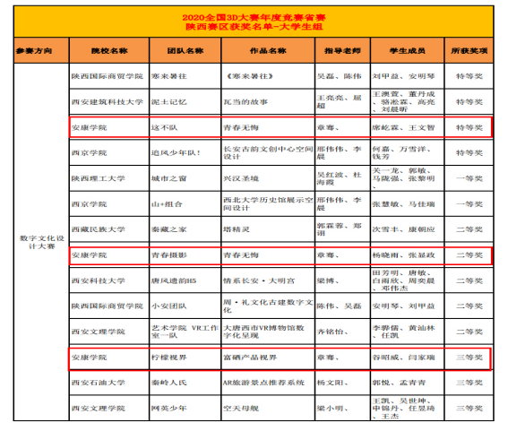 11月5日,第十三届全国三维数字化创新设计大赛省赛作品评审结果揭晓,PT平台电子游戏官网学生取得佳绩,PT平台电子游戏学生获得陕西省赛区数字文化设计类特等奖1项,二等奖1项,三等奖1项,有1部作品被推荐参加国赛。