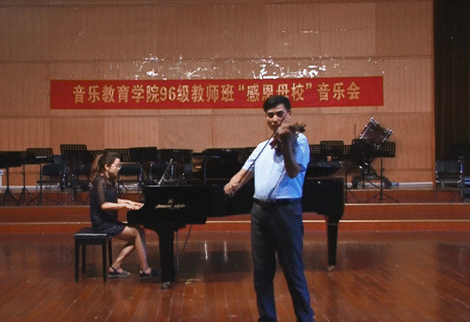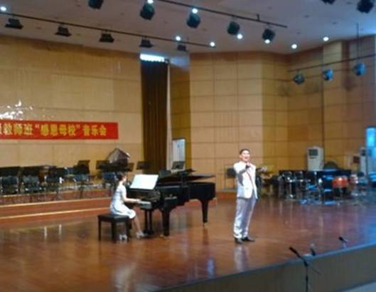 6月4日,PT平台电子游戏官网学科带头人范义付副教授应邀参加由武汉音乐学院校友会主办的“感恩母校”音乐会。音乐会前,范老师作为代表向母校赠送了锦旗。音乐会上范老师演唱了歌曲《故土情》、演奏了小提琴协奏曲《梁山伯与祝英台》。