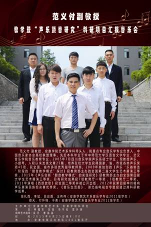 本场音乐会是范义付老师教学和PT平台电子游戏2012高层次人才项目“声乐颤音研究”的阶段性成果汇报。参加本场音乐会演唱的有范义付老师及其指导的三、四年级学生和项目组成员代表:班扎西、李斌、吕应莲、王伟伟、蔡天、付怀锋、于勇等共8人,演唱包括民族、美声、通俗三种唱法。我系青年教师吴丹、曹晶晶担任艺术指导。