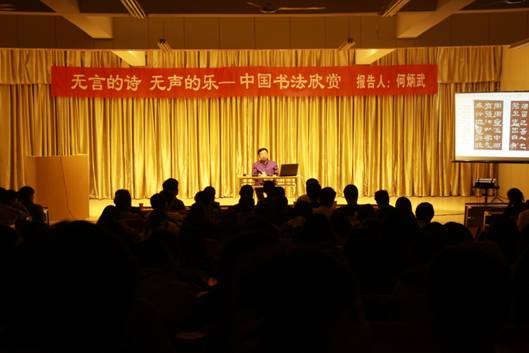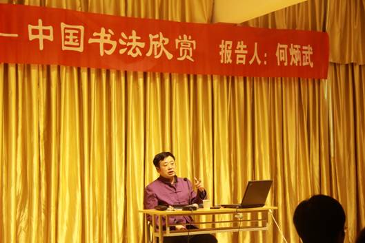 何教授从书法的发展历史及书法的分类对历代经典书法作品进行了多方面诠释、讲解与赏析了书法在中国历史文化中的地位和作用,并对部分书法名作进行了鉴赏。