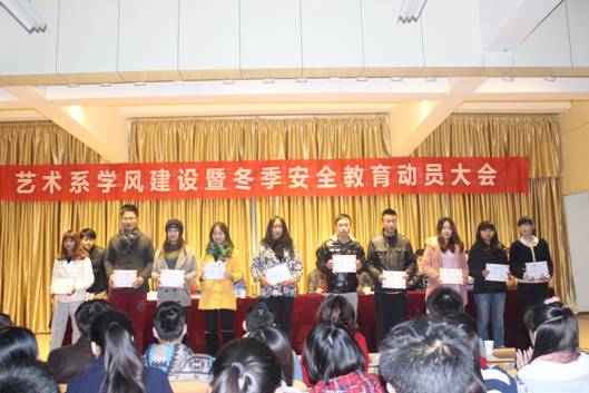 2013年12月17日晚7:30,我系在江北校区1401教室召开了“艺术系学风建设暨冬季安全教育动员大会”。系主任单福东、系党总支书记冯丰收、系副主任章长青、雷升录、系办公室副主任肖剑及绘画、设计、音乐、艺术教育教研室主任和全体辅导员出席了会议。大会由系学工办主任刘泽桢主持。2013级全体学生和大四、大三、大二受表彰的学生参加了会议。