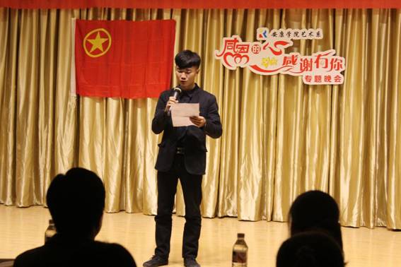冯书记动员讲话后,团总支副书记祁宏斌代表团总支宣读《艺术系“感恩存心、感谢有你”感恩教育活动方案》。2013级视觉传达专业1班团支部书记杨泽昊同学代表各团支部向全体13级团员青年发出开展感恩教育活动的倡议。
