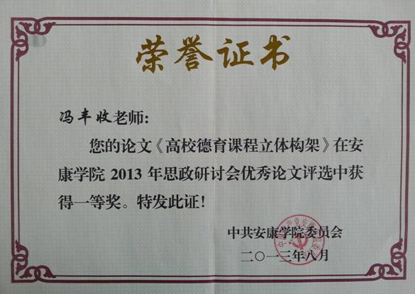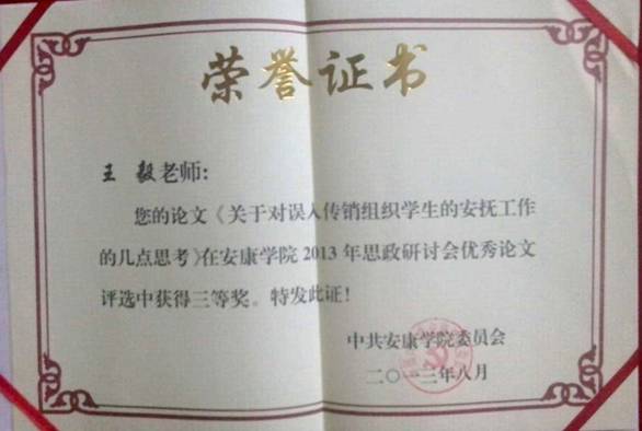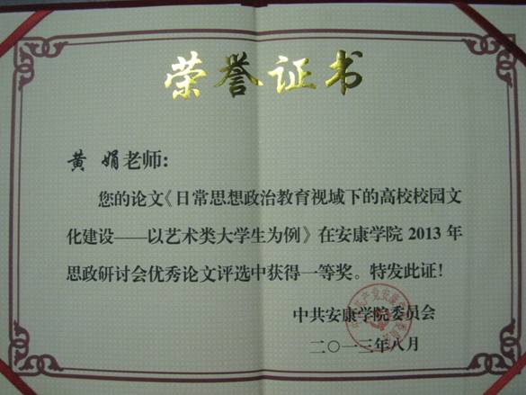 同时冯丰收同志的论文《高校德育课程立体构架》、黄娟同志的论文《日常思想政治教育领域下的高校校园文化建设——以艺术类大学生为例》获研讨会优秀论文一等奖;王毅同志的论文《关于对误入传销组织学生安抚工作的几点思想》获研讨会优秀论文三等奖。