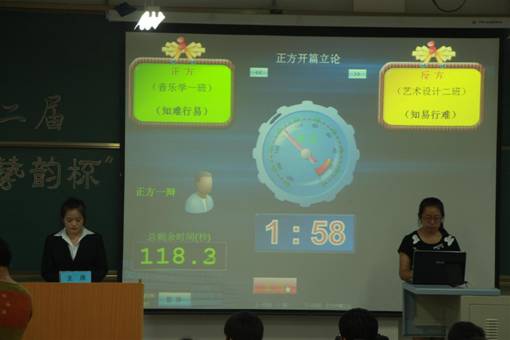 本届辩论赛有来自2012级美术学、音乐学、艺术设计、艺术教育专业共12支代表队参加了初赛,有6支队伍脱颖而出进入复赛。经过复赛的比拼,音乐学1班代表队和艺术设计2班代表队进入了最后的角逐。当晚,两队就“知难行易”还是“知易行难”的话题展开了激烈的交锋。