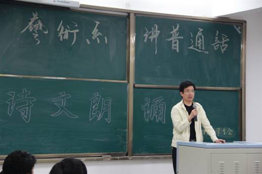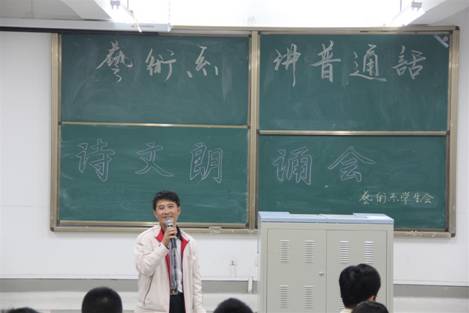 4月15日晚,我系“讲普通话诗文朗诵会”在江北校区2102教室举行。系党总支书记冯丰收、系学工办主任刘泽桢、系学生会干部、2012级学生代表及艺术教育班全体同学参加了诗文朗诵会。