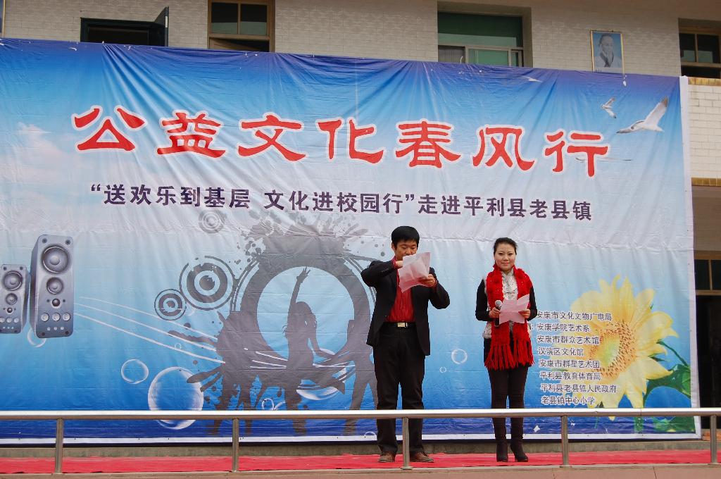 由安康市文化文物广电局主办,PT平台电子游戏艺术系、安康市群艺馆、安康市青少年宫等单位承办的我市一年一度的“文化艺术三下乡”活动,于2011年1月14日在平利县老县镇拉开了帷幕,受到当地领导和群众的热烈欢迎。