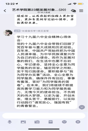 “中国共产党第十九届中央委员会第六次全体会议总结了党百年奋斗的重大成就和历史经验,作为新时代思想政治辅导员,我更应该承担起属于我的责任与使命,坚定理想信念,始终坚持中国共产党的坚强领导,以科学的理论武装自己的头脑,牢记全心全意为人民服务的宗旨,在工作和生活围绕学生、服务学生、关照学生。”