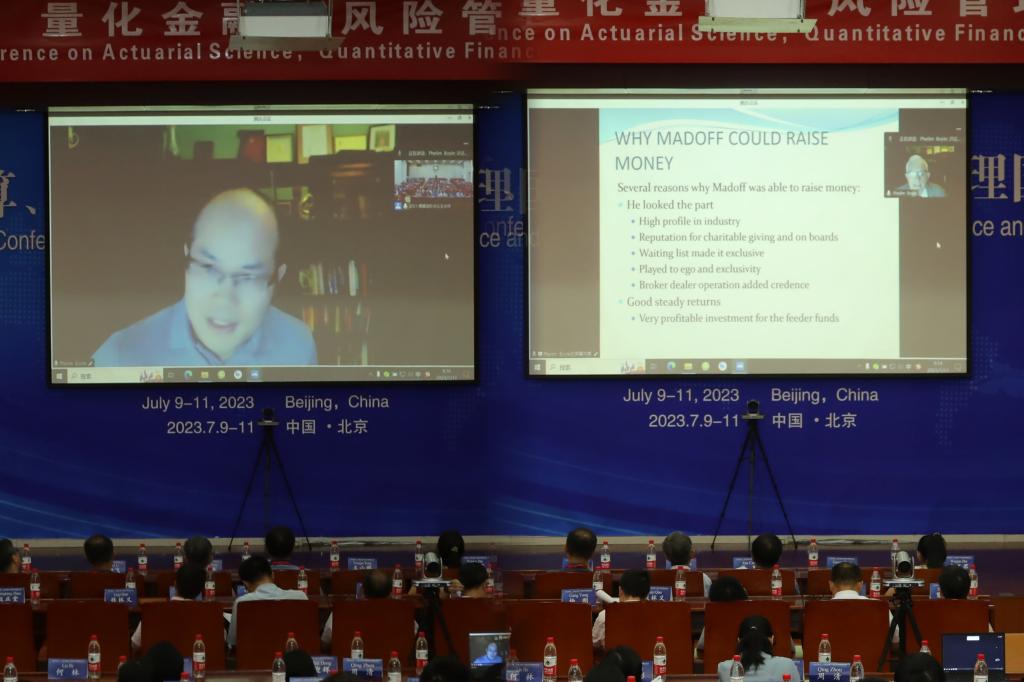 7月11日上午,大会主题报告由翁成国教授主持,Phelim Boyle教授围绕庞氏骗局进行了报告,从一些著名的庞氏骗局出发,分析了它们的投资策略,讨论了这个问题未来的研究机会及面临的挑战。