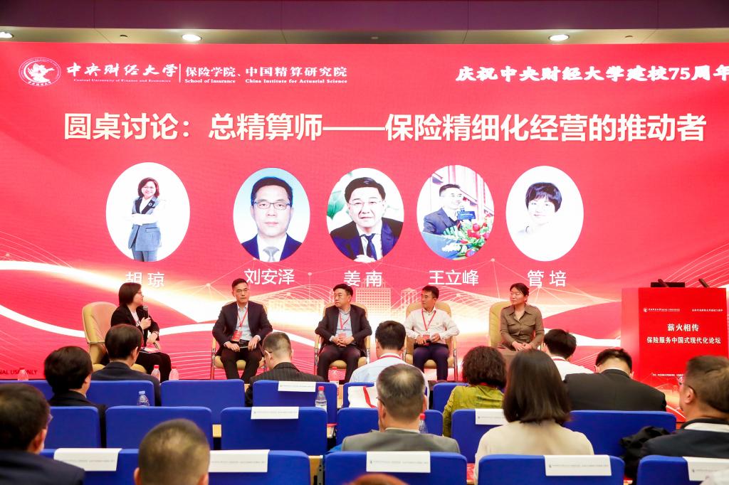 第二场圆桌论坛的主题为“总精算师——保险精细化经营的推动者”,分享嘉宾为中荷人寿总精算师兼首席风险官、1997级校友姜南,华泰财险数字化业务总监兼战略与创新发展部总经理、1999级校友王立峰、中意人寿总精算师、2001级校友管培,英大泰和财险总精算师、2004级校友刘安泽。由慧保天下创始人兼CEO、文传学院2001级校友胡琼主持该环节。