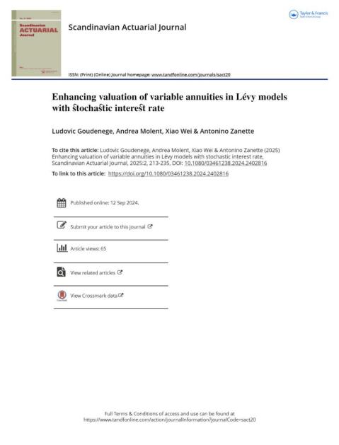 伟德官网韦晓副教授近日在A类精算顶刊Scandinavian Actuarial Journal发表论文“Enhancing valuation of variable annuities in Lévy models with stochastic interest rate”。