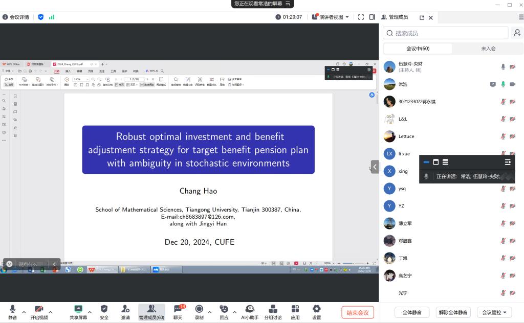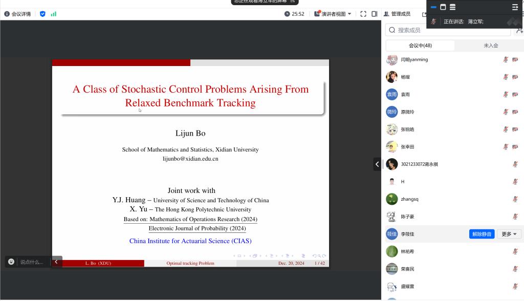 2024年12月20日下午,中国精算研究院在腾讯会议以线上形式成功举办了精算论坛第254期讲座。西安电子科技大学的薄立军教授和天津工业大学的常浩教授应邀出席,并为与会师生分别带来了题为“A Class of Stochastic Control Problems Arising from Relaxed Benchmark Tracking”和“Robust optimal investment and benefit adjustment strategy for target benefit pension plan with ambiguity in stochastic environments”的精彩学术报告。本次讲座由伟德官网韦晓老师和伍慧玲老师联合主持,参与师生达60余人。