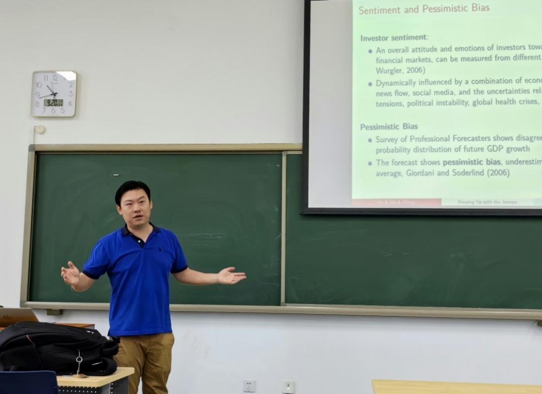 2024年9月20日,麦考瑞大学商学院的Lei Shi博士应邀在伟德betvlctor体育官网沙河校区二教107为伟德官网师生带来了一场题为《Sentiment and Asset Price Dynamics under Keeping up with the Joneses》的学术报告。本次学术报告由精算科学系副主任郑敏主持,Lei Shi博士深入探讨了攀比效应("Keeping up with the Joneses",简称KUJ)、投资者情绪(Investor sentiment)以及悲观偏见(Pessimistic Bias)等概念,并阐述了这些因素如何影响资产价格的动态变化。