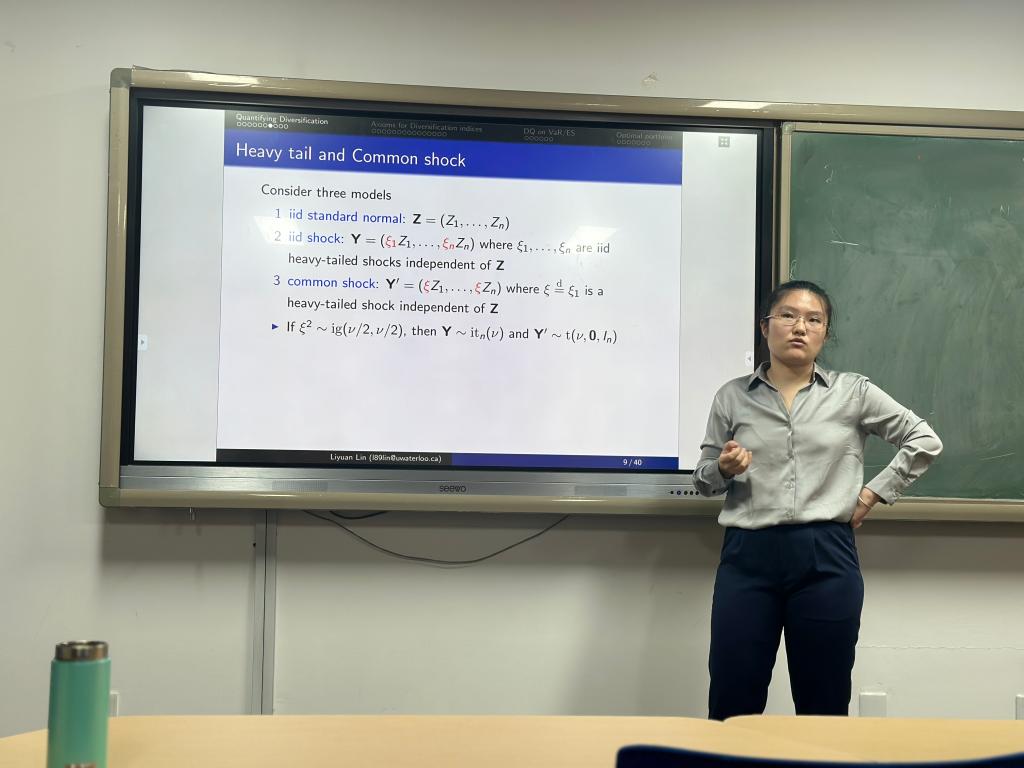 )及其性质,并通过实例展示了其在评估投资组合多样性上与DR指标的区别。在讲座的最后,林博士探讨了将DQ指标作为投资组合最优化问题目标函数的可能性,并指出相对于传统的目标函数,该目标函数求解更为困难。精彩的报告之后,与会师生与林博士就DQ指标的定义与形式以及作为投资组合最优化问题目标函数过程中可能存在的困难等问题进行了热烈地讨论。