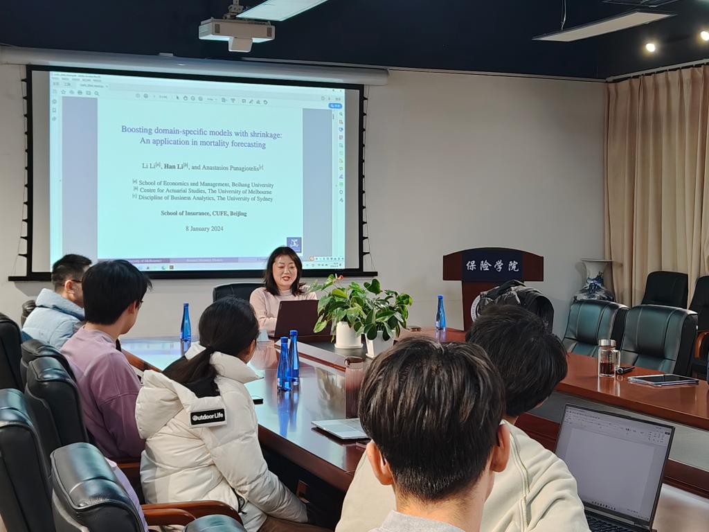 2024年1月8日下午,应中国精算研究院廖朴副教授邀请,墨尔本大学李涵副教授在伟德betvlctor体育官网沙河校区13号楼215会议室给伟德官网师生作了精彩的学术报告。廖朴副教授、郑敏副研究员出席,学院博士研究生、硕士研究生聆听报告。