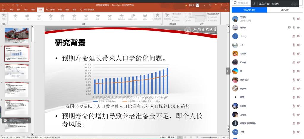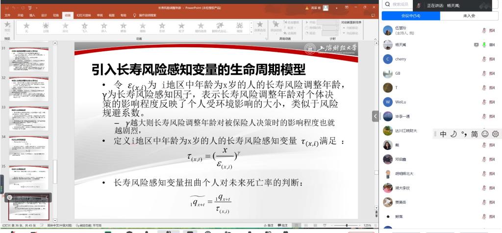 超过55人在线参加了报告会。师生们在会后就模型构建、长寿风险感知变量、长寿风险调整年龄的计算步骤等问题展开了激烈地讨论。