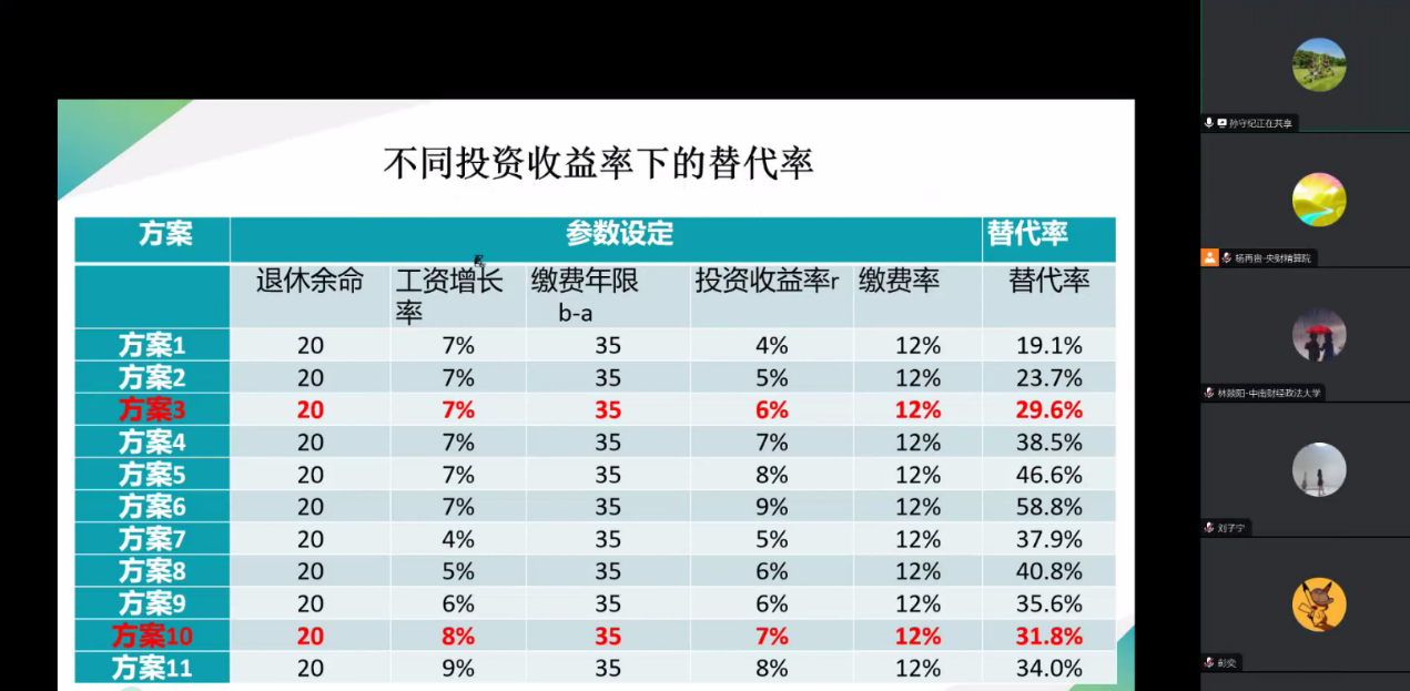 伟德betvlctor体育官网刘子宁助理教授主持了平行分会二。伟德betvlctor体育官网博士生靳佳明报告了论文《全国统筹调剂下养老保险基金收支效应和财政负担研究》,基于现行的全国统筹调剂办法建立精算模型,模拟发现全国统筹调剂制度与延迟退休、提高征缴率等措施相结合,可有效降低财政负担。中南财经政法大学硕士研究生林燚阳报告了论文《新业态从业人员养老保险的参保选择:缴费指数和缴费年限越高越好吗?——基于基金可持续和养老金替代率的视角》,建立精算模型探究何种缴费指数和缴费年限是合适的参保选择,建议为新业态从业人员制定弹性缴费政策和分级补贴政策。对外经济贸易大学伟德betvlctor体育官网孙守纪副教授讲解了《中国企(职)业年金的长期投资目标与“长钱短投”困境的解决之道——基于精算预期收益率视角的一个统一的分析框架》一文,深入分析了长期投资目标、投资管理框架和治理结构之间的内在联系,从治理结构、投资管理框架、精算报告和投资选择权等四个方面完善我国企(职)业年金投资管理制度提出建议。伟德betvlctor体育官网孙祎婉博士报告了论文《中国城镇长期护理保险制度需求规模测算及筹资机制研究》,对比分析了长护险制度独立筹资与依托医疗保险基金筹资机制假设下的财务可持续性,建议通过划转个人账户资金或提高个人筹资比例等方式、尽快建立起长期护理保险基金独立累积账户。