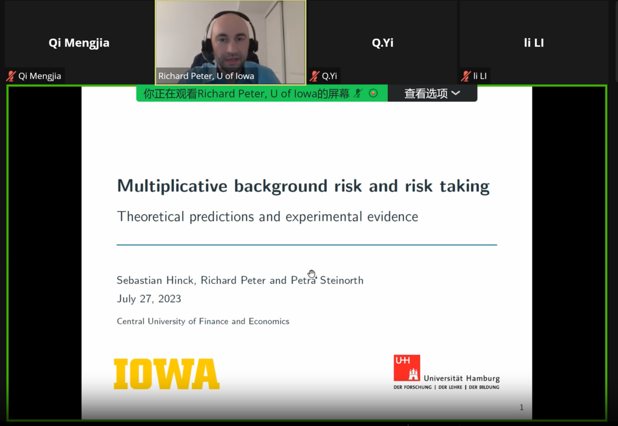 为活跃学院的学术氛围、促进国内外保险精算学术交流,应中国精算研究院池义春研究员邀请,美国爱荷华大学金融系的Richard Peter副教授于2023年7月27日中午通过zoom会议给伟德官网师生做了题为“Multiplicative background risk and risk taking”的精彩学术报告。