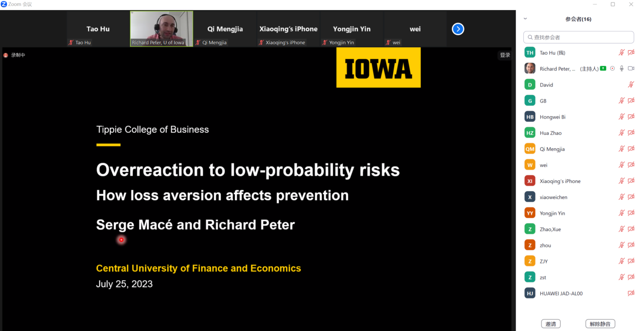 为活跃学院的学术氛围,促进国内外保险精算学术交流,应中国精算研究院池义春研究员邀请,美国爱荷华大学金融系的Richard Peter副教授于2023年7月25日中午通过zoom会议给伟德官网师生做了题为“Overreaction to low-probability risks”的精彩学术报告。