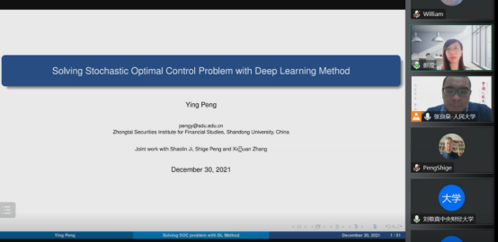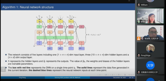 彭滢副教授的报告题目是《Solving Stochastic Optimal Control Problem with Deep Learning Method》。她从随机最大值原理出发,通过深度学习解决高维随机最优控制问题。首先,彭滢副教授介绍了基于深度学习方法求解全耦合的正倒向随机微分方程,并将其用于求解随机控制问题。然后,彭滢副教授通过引入具有最大值条件的正倒向随机微分方程的扩展哈密顿系统,将原来的随机最优控制问题转化为带有最大值条件的正倒向随机微分方程,并将其化成一个新的控制问题,最后通过深度学习方法求解新的控制问题。根据最优控制是否有显式解,文章提出了三种算法来解决新的控制问题,数值结果证明了该算法的有效性,尤其在高维情况更明显。