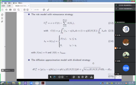 姚定俊教授报告题目为“Optimal dividend, reinsurance and premium control strategies for insurance company”。文章主要研究了从保险人角度出发,以最大化累积分红为目标,保险公司最优的分红策略、再保险策略和保费策略的选择问题。假设保险公司的产品价格与索赔频率是相关的情况下(减函数、凹函数),采用动态规划原理求解出最优的比例再保险和超额损失再保险策略、最优保费策略、最优的障碍分红边界,以及最优累积分红。