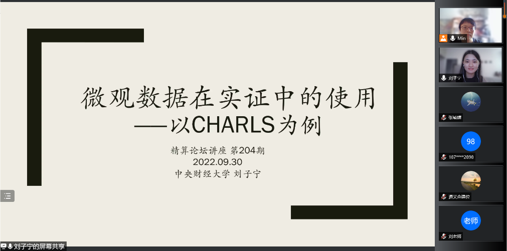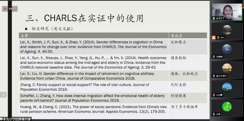 刘子宁博士报告的题目为“微观数据在实证中的使用——以CHARLS为例”。首先,刘子宁介绍了常用的数据类型,重点介绍了国内常用的公开微观数据库,并且以CHARLS为例分析了如何使用微观数据来分析感兴趣的问题。其次,刘子宁介绍了其他途径获得的数据。比如通过自己设计调查问卷来获得一手数据,或者通过行政机构获得行政数据。这两类数据较公开的微观数据库更难以获得。此外,刘子宁介绍了通过爬虫历史文本和网络数据获得的数据以及气象和环境等自然科学领域的数据。这类数据往往可以用来关注一些跨领域的研究问题。最后,刘子宁介绍了不同类型数据之间的整合,用于服务相关的研究问题。